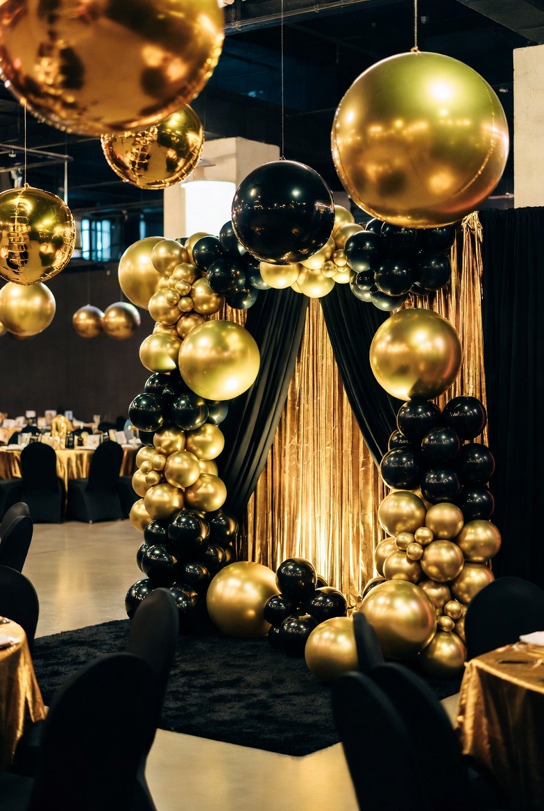 Decoración: Globos dorados/metálicos, manteles dorados o amarillos, cortinas drapeadas económicas en tela dorada, luces LED amarillas, centro de mesa con flores artificiales doradas y confeti. Ambiente festivo y brillante, pero sencillo.